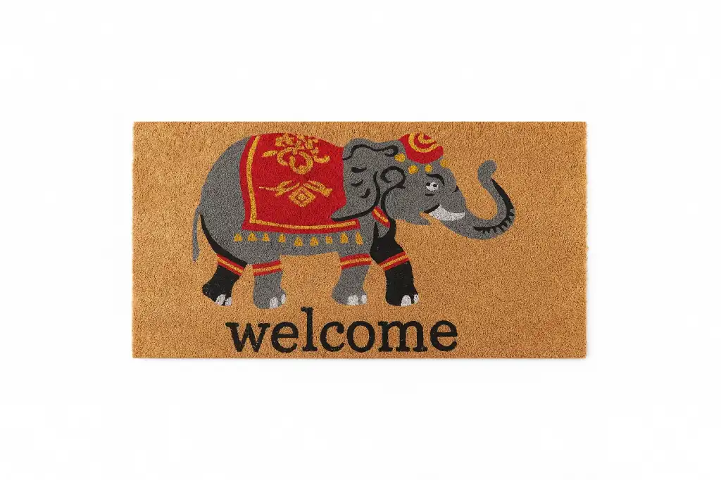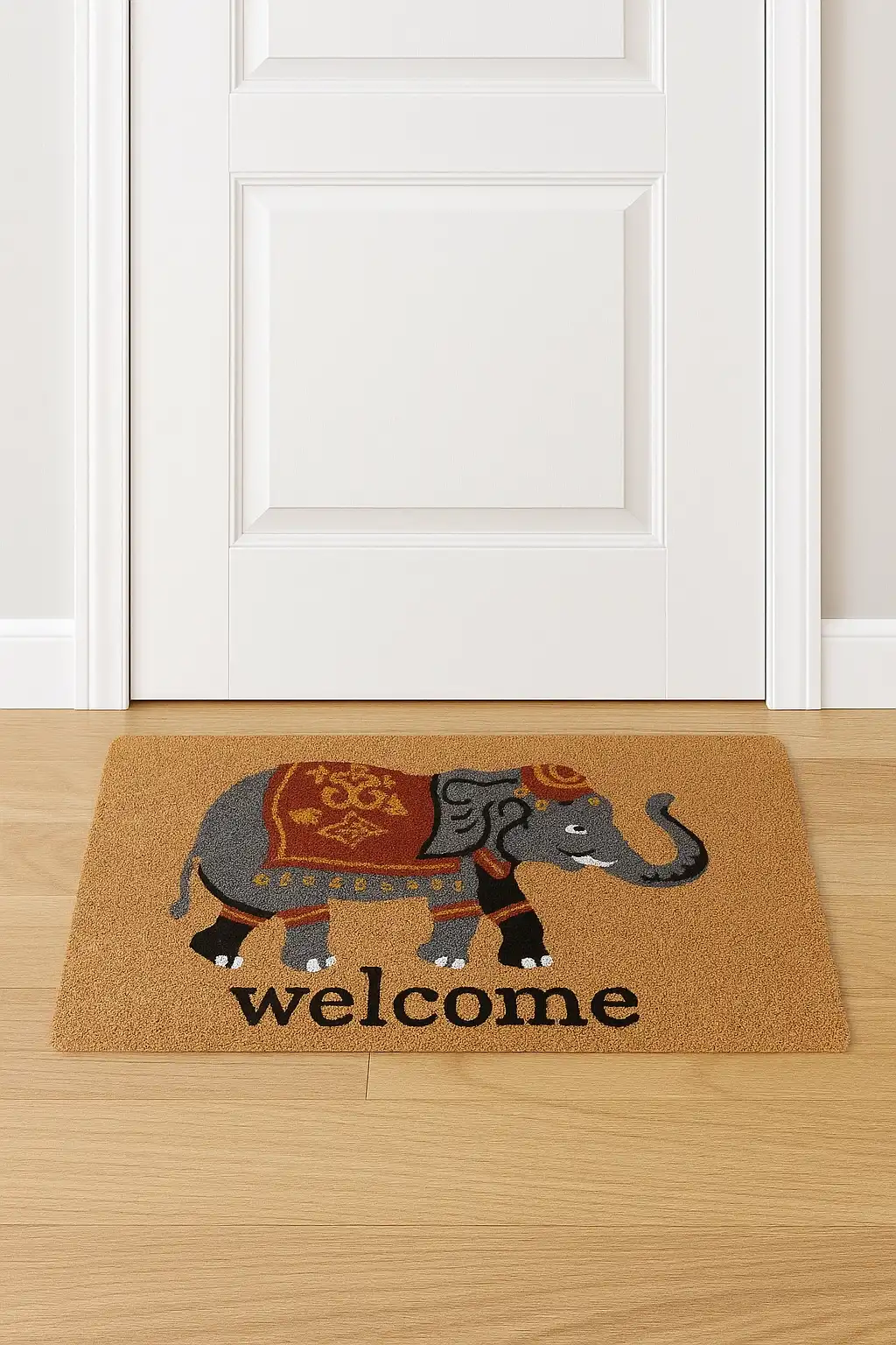 Fil Desenli Welcome Coco Kapı Paspası, dekoratif tasarımıyla giriş alanlarına karakter ve zarafet kazandırır.